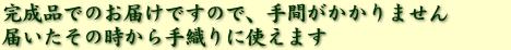 | 経糸の色を決める場合、糸の太さや経糸密度によりその色が影響されなかったり、または目立ったりします。経糸密度が細いほど、経糸が目立ち、しっかりした物が織れます。逆に経糸密度が粗いと経糸の色はあまり影響されず、地厚でザックリした織り上がりになります。また、これらの糸を緯糸にも使用して、マフラー・ショール・テーブルセンターなど風合いのやわらかい織物ができます。 |